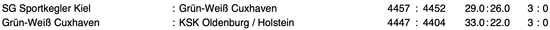 In der 2. Bundesliga der Sportkegler feierte die KSG Cuxhaven / Stade den ersten Auswärtssieg In Wolfenbüttel gab es einen 3:0-Erfolg. Auf der Bahnanlage in Derenburg war dagegen nichts zu holen. Gegen...