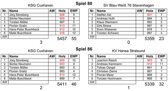Die Startkette der Gäste von der Müritz setzte die Cuxhavener gleich mächtig unter Druck. Jörg Storsberg (908) und Sönke Neumann (909) ließen sich aber nicht aus der Ruhe bringen und brachten ihre Mannschaft mit 22 Holz in Führung. Auch Torsten Möller (897) und Florian Graitz (913) mussten Schwerstarbeit verrichten, um den Gegner auf Distanz zu halten, bevor Malte (918) und Hans-Peter Buschbeck (912) den sicheren ersten Heimsieg perfekt machten.