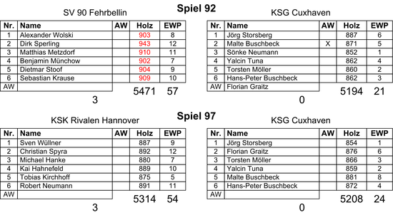 Für die KSG kamen zum Einsatz: Jörg Storsberg (887+854), Malte Buschbeck / Florian Graitz (871), Torsten Möller (860+866), Sönke Neumann (852), Yalcin Tuna (862+859), Hans-Peter Buschbeck (862+872), Florian Graitz (876) und Malte Buschbeck (881).