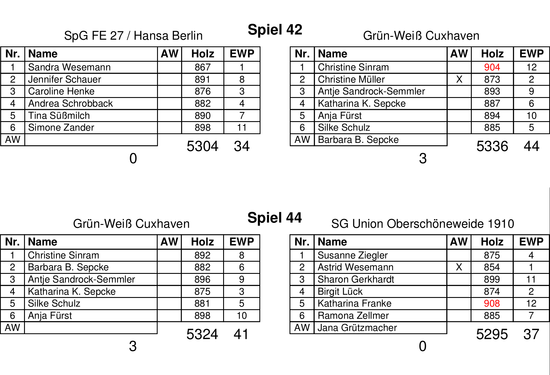 Dank des starken Auftaktes durch Christine Sinram (904) neben Christine Müller / Barbara Sepcke (873) gingen die Cuxhavenerinnen wunschgemäß gegen S.Wesemann (867) und J.Schauer (891) in Führung, die Antje Sandrock-Semmler (893) und Katharina Sepcke (887) gegen C.Henke (876) und A.Schrobback (882) noch ausbauen konnten. Das reichte für Anja Fürst (894) und Silke Schulz (885), um die drei Punkte gegen T.Süßmilch (890) und S.Zander (898) abzusichern.