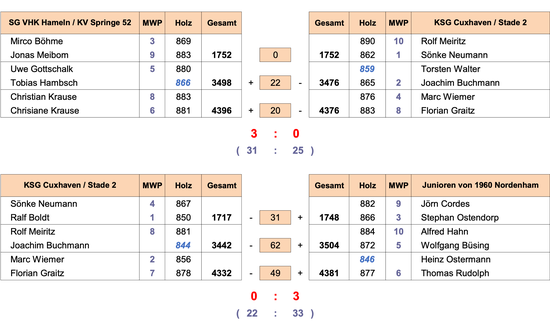 (2) Im Nachmittagsspiel sollte es gegen die Nordenhamer mit Punkten klappen. Doch auch daraus wurde nichts. Im Gesamtergebnis des Vormittags hatte man 20 Holz weniger aufzuweisen. Und auch die Nachmittagsansätze lagen nicht allen Spielern.